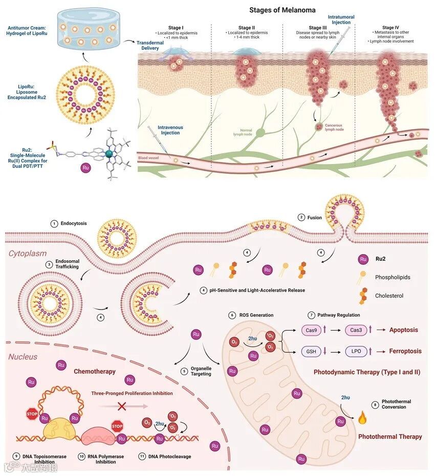 图2. 透皮递送的钌配合物-脂质体-水凝胶体系用于红外光控制的药物释放和光动力/光热/化疗协同抗肿瘤治疗
