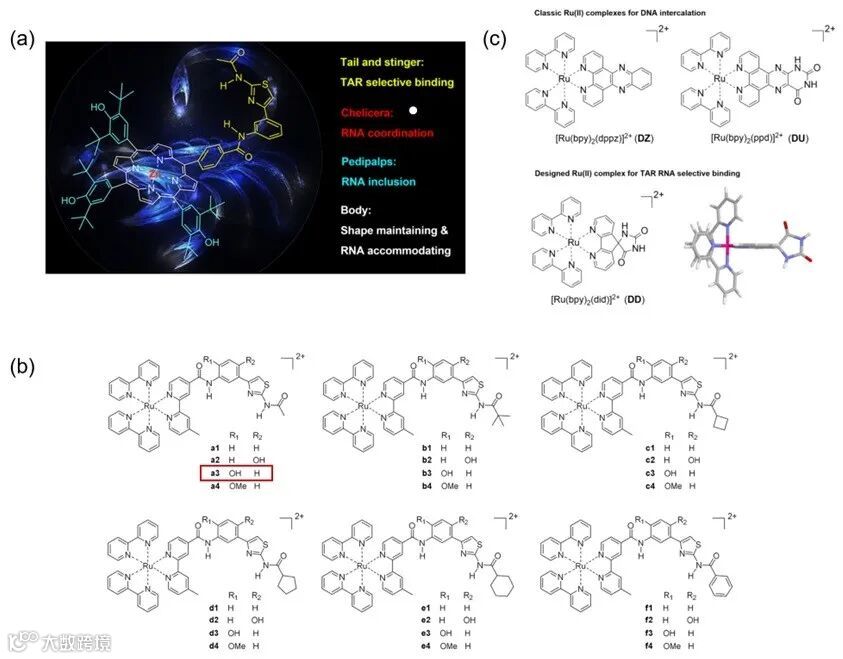 一系列二联和三联吡啶的钌配合物被设计来探索连接基团的长度、柔性等对配合物与RNA结合过程的影响(J. Inorg. Biochem., 2022, 234, 111880; Inorg. Chim. Acta, 2022, 539, 121027)。实验证明,短的和刚性的连接基团对其RNA结合有利。随后,该课题组对RNA识别基团进行了进一步的修饰和改造,最终获得了对TAR RNA具有更强选择性和亲和力的钌配合物(J. Inorg. Biochem., 2024, 259, 112664,图3b)。最近,全新设计的含有螺环配体的钌配合物能够增强配合物的RNA结合能力的同时降低其对DNA的结合能力,显著提升靶向选择性(Inorg. Chem., 2024, 63, 12342-12349,图3c)。另外,钌配合物优异的荧光性质还使其成为了病毒RNA的荧光探针。