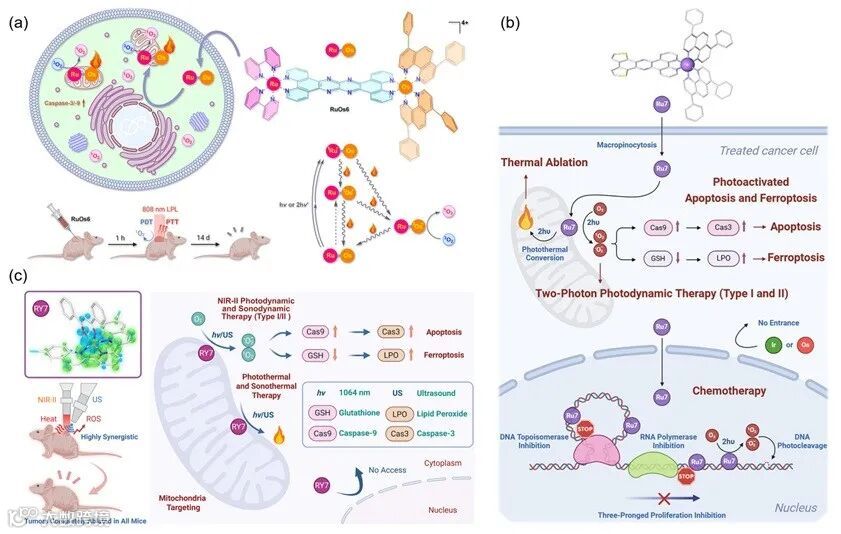 为了克服光治疗中光穿透深度不足和乏氧实体肿瘤内氧供应的限制,该课题组进一步引入超声波作为红外光的辅助激发机制,利用激发声敏剂产生空化效应,释放出高能量的机械能、热能、以及ROS物种,实现肿瘤的光动力/声动力/光热协同的抗肿瘤效应。一系列乙酰丙酮钌配合物中的代表性分子RY7实现了在近红外二区光和超声的双重激发下对小鼠体内耐药肿瘤的完全消融(J. Med. Chem., 2025, 68, 17653-17666,图1c)。一些单核和双核钌配合物(Inorg. Chem. 2025, 64, 9596-9607; ChemBioChem, 2025, 26, e202400801)也表现出较好的光、声、热协同抗肿瘤效果。