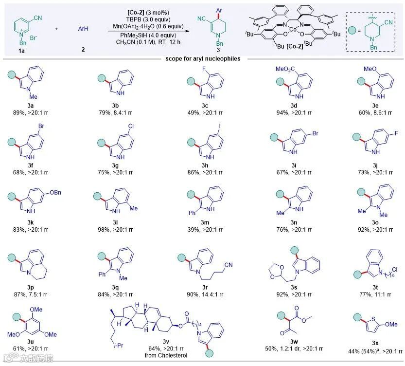 作者选择以1-苄基3-氰基吡啶盐(1a)和1-甲基吲哚(2a)作为模板底物对反应条件进行优化,结果显示Co(salen)复合物([Co-2])为配体、过氧化苯甲酸叔丁酯(TBPB)为氧化剂、Mn(OAc)2‧4H2O为添加剂和二甲基苯基硅烷(PhMe2SiH)作为还原剂能以89%的分离收率和优秀的区域选择性得到吡啶盐C-4位芳构化的产物3a。在无金属参与的条件下,以氟磺酰基二氟乙酸甲酯为添加剂和二甲基苯基硅烷(PhMe2SiH)为还原剂能以94%分离收率得到吡啶盐C-2位芳构化的二氢吡啶产物4a。确定上述最优反应条件后,作者首先考察了钴催化吡啶盐C-4位选择性氢芳基化的底物适用范围(图2),结果显示该反应对含不同位置和不同电性基团如氟、溴、氯、碘、酯基、甲基和醚基取代的吲哚化合物均可兼容,以良好产率和区域选择性得到目标C-4位氢芳基化的产物。值得注意的是,当吲哚的2-位引入位阻更大取代基团,如甲基和苯基,也能顺利参与反应,能以39%-92%的收率得到目标产物。此外,一系列带有氰基、缩醛、氯、酯、烯基和炔基等不同官能团以及胆固醇衍生的N-烷基化吲哚化合物同样适用该反应体系,并以中等至良好产率和优异的区域选择性得到相应的产物。其他的亲核底物如均三甲氧基苯、乙酰乙酸甲酯和2-甲氧基噻吩均成功地转化为C-4位氢芳基化的产物,且产率为中等。