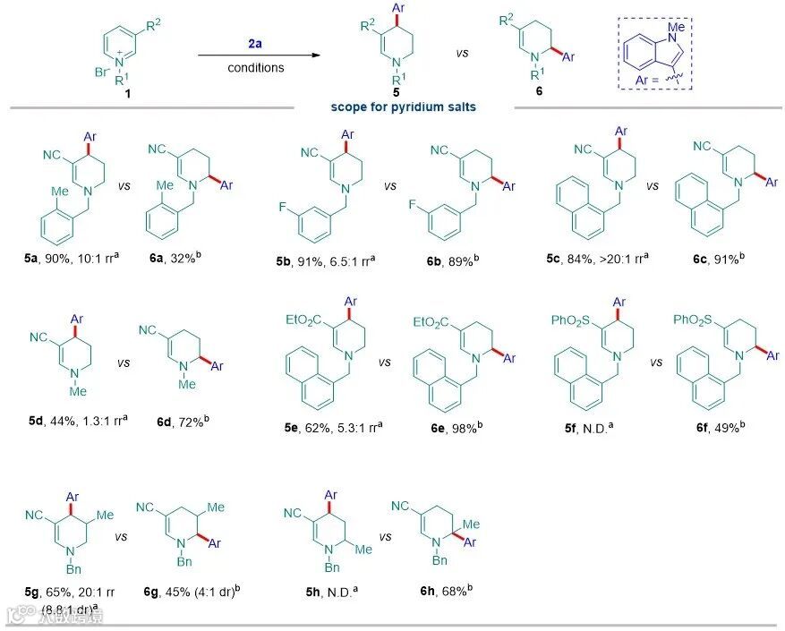随后作者进一步考察了吡啶盐的适用范围,以1-甲基吲哚2a为模板底物,在最优条件下分别探索吡啶盐C4和C6位选择性还原氢芳基化反应中吡啶盐底物的普适性(图4)。N-苄基吡啶盐的苯环上引入甲基和氟原子在反应中均能很好地耐受,以良好的收率和区域选择性生成相应C4和C6位选择性的二氢吡啶化合物。此外,N-2-萘甲基和N-甲基吡啶盐也可参与反应,成功地转化为相应的目标产物。值得注意的是,将吡啶环上的氰基替换为其他吸电子基团(如酯基、砜基)后,反应仍能顺利进行,产物的收率49%–98%。作者也测试了吡啶环不同位置的取代效应,发现C5-甲基取代的吡啶盐表现出良好活性,以良好收率得到目标产物。相比之下,C6位甲基取代的吡啶盐仅给出C-6位选择性产物,收率为68%,但未能检测到C-4位选择性产物。遗憾的是,不含吸电子基团的吡啶盐无法发生C-4或C-6选择性还原氢芳基化反应。