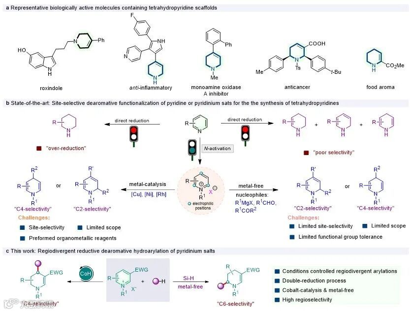 近日,南方科技大学舒伟团队发展了一种钴催化和无金属条件下实现了吡啶盐与芳基亲核试剂的区域选择性、位点发散性还原氢芳基化反应,可在温和条件下直接获得不同位置芳基取代的多样四氢吡啶衍生物(图1c)。相关工作发表在Nature Communications 上。