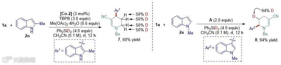 接下来,作者对反应的机理进行了初步探索(图5)。在Ph2SiD2存在下,吡啶盐1a与2-甲基吲哚2n反应,得到C-4选择性还原氢芳基化产物7,其哌啶骨架上的C5和C6位各引入两个氘原子,且分布均等,说明Co-H对吡啶环发生连续迁移插入时无面选择性。此外,在无金属条件下,吡啶盐1a与1-甲基吲哚2a在Ph2SiD2作用下,以94 %收率获得C-6选择性还原氢芳基化产物8,仅在哌啶环C5位引入一个氘原子。