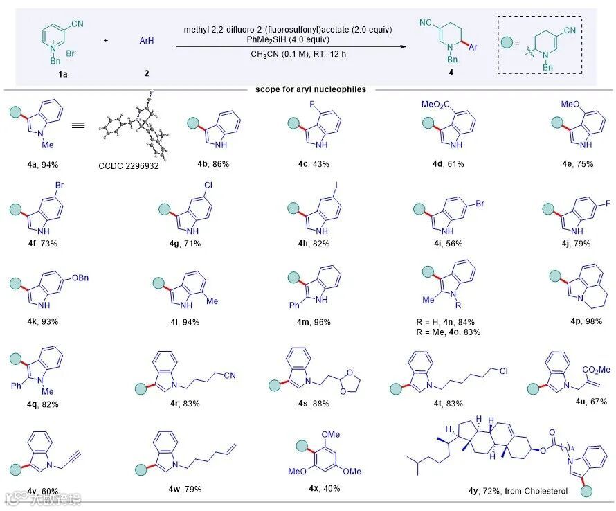 图2. 吡啶盐C-4位选择性氢芳基化反应中芳基亲核试剂的适用范围