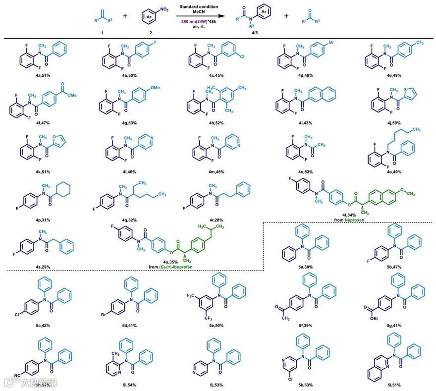 其次,为拓展该光诱导体系在合成酰胺衍生物中的应用范围,研究进一步考察了α-烷基苯乙烯、不对称二烷基/芳基烯烃及多取代烯烃的适用性。以对二氟硝基苯为硝基源,多种含不同取代基(卤素、吸电子基、多环及杂环)的α-烷基苯乙烯均能顺利反应,以良好产率生成相应N-甲基酰胺,表明底物电子性质影响较小。通过使用不对称二烷基烯烃,研究发现甲基在迁移过程中具有明显偏好。此外,1,1-二苯乙烯与多种缺电子硝基芳烃可高效形成N,N-二苯基酰胺,且杂芳基的迁移能力强于苯基。对于多取代烯烃,三取代与四取代烯烃虽仍可反应,但由于立体位阻增大,其产率普遍低于末端烯烃。这些结果共同证明,该策略能够兼容结构多样的烯烃与硝基芳烃,成功构建出具有潜在药物价值的复杂酰胺骨架,并揭示了迁移基团的选择性规律,为其在合成化学中的进一步应用奠定了基础。