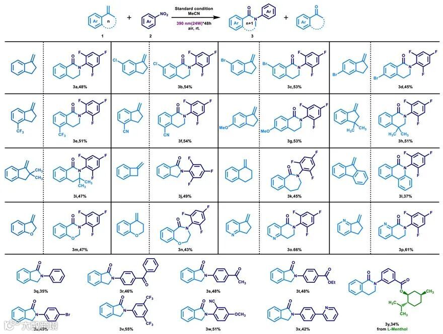 首先,作者系统研究了以硝基芳烃对烯烃进行光诱导氧化裂解过程中副产物酰胺的形成机制与应用潜力。研究通过模型反应评估了多种烯烃和硝基芳烃的适用性,发现不同环状芳基烯烃均可高效转化为相应的N-芳基内酰胺,且芳环上的取代基(包括卤素、吸电子与给电子基团)对反应影响较小,展现了良好的官能团耐受性。该体系对多环及杂环芳基烯烃同样有效,并能实现芳基迁移,其迁移选择性与经典贝克曼重排有所不同。在硝基芳烃适用范围研究中,电子缺乏型硝基芳烃表现出更高的反应效率,多种含吸电子基的底物均能以良好产率获得目标内酰胺。此外,反应在克级规模中成功实施,证实了其合成实用性。整体研究表明,该光诱导策略能够高效、多样性地构建具有潜在药物价值的内酰胺骨架,为相关功能分子的合成提供了新途径。