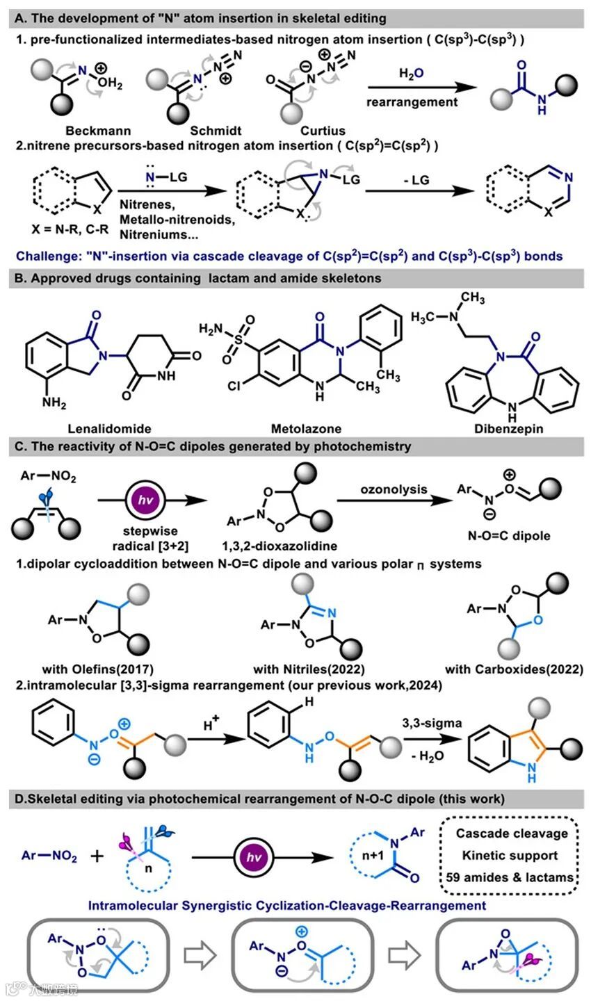 内酰胺与酰胺是药物化学中广泛存在的关键结构骨架,开发高效、绿色的合成新方法具有重要意义。近年来,以氮原子插入为核心的骨架编辑技术为氮杂环的构建开辟了新路径。现有策略主要分为两类:一类基于预官能化中间体的重排反应,另一类则依赖于氮烯前体的协同插入过程。然而,如何在温和条件下实现C(sp2)=C(sp2)与C(sp3)–C(sp3)键的断裂并精准引入氮原子,仍是该领域的重要挑战。同时,光诱导硝基芳烃对烯烃的氧化裂解过程已成为一种生成N-O=C偶极子的有效方法。这些偶极子表现出不同的反应性,使得N-O=C偶极子的重排成为在骨架编辑中实现氮原子插入的有效策略。