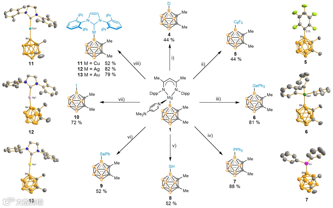 随后,作者对所合成碳硼烷笼硼-镁试剂的亲核性进行了系统研究(图3)。该试剂不仅能够与全氟苯C6F6进行反应,构筑B-C键;与多种主族化合物,如Ph3GeCl、Ph2PCl、S8、PhSeCl、I2反应,构筑不同的硼-主族元素键;还能够与过渡金属铜、银、金的卤化物反应,构筑硼-过渡金属键。这些反应展示了碳硼烷笼硼-镁试剂1强的亲核性,及广阔的应用前景。