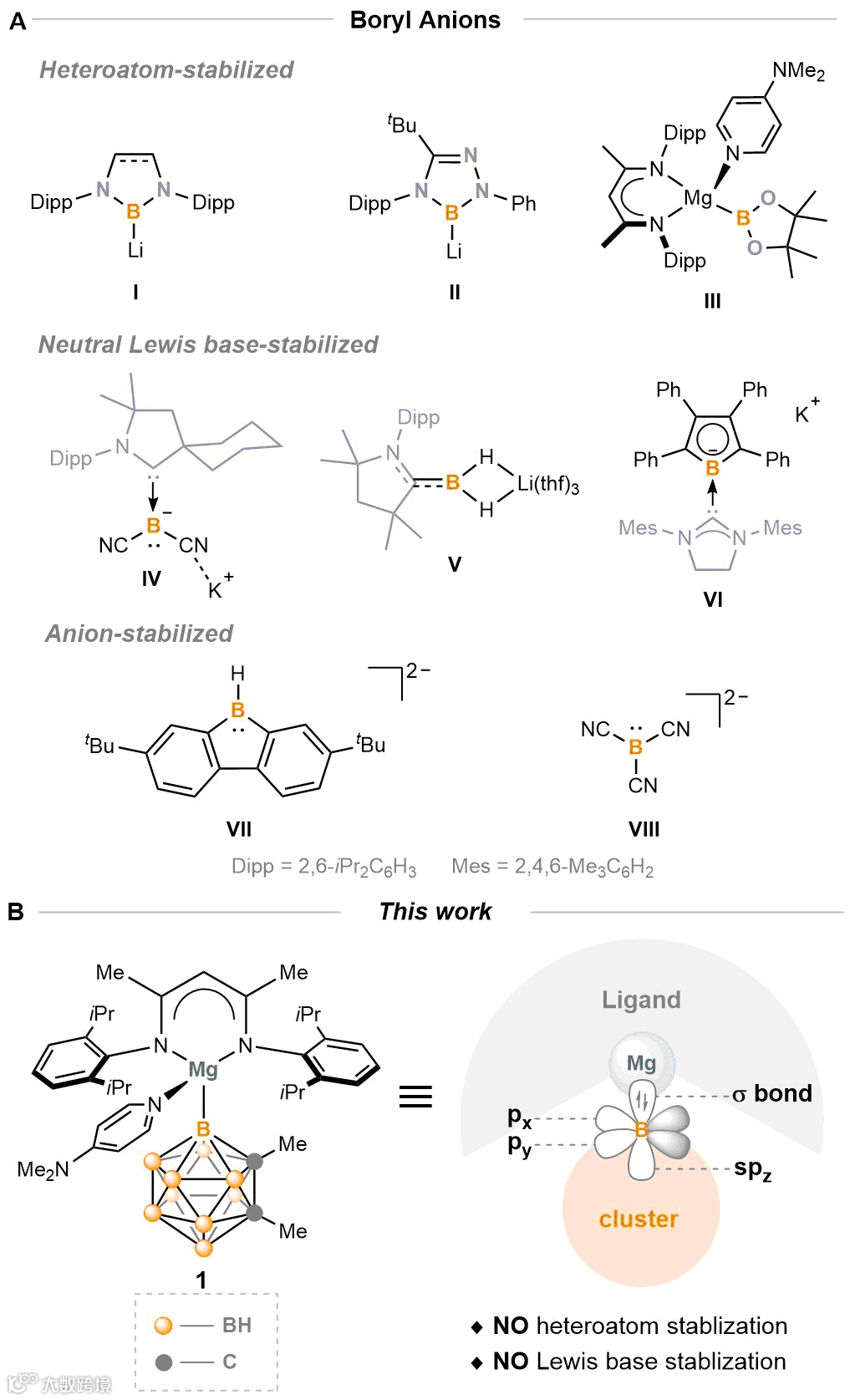 亲核性硼化学始于对过渡金属硼基配合物的研究:早期发现,过渡金属以d电子向硼空p轨道“推”电子来稳定M-B键。2006年,Nozaki与Yamashita教授团队报道了首例亲核性氮杂环硼阴离子I(图1A)。I可与多种亲电试剂反应构筑多样的B-E键(E = B、C、P、Be、Mg、Cu、Sc等),成为该领域里程碑,并催生了一系列杂原子或路易斯碱(尤其是π配体)稳定的硼阴离子(II-VIII,图1A)。然而,无杂原子、无π配体稳定的“裸”硼阴离子相关研究仍是空白。南方科技大学谢作伟院士团队长期致力于碳硼烷化学和硼化学相关研究,他们认为仅含C、B、H原子的碳硼烷骨架是合成这种无杂原子、无π配体稳定“裸”硼阴离子的理想平台。谢作伟院士团队据此首次合成并分离鉴定了碳硼烷笼硼-镁试剂(图1B),该试剂表现出优异的亲核性,可与有机、主族及过渡金属亲电试剂发生反应,构筑多样的碳硼烷硼-元素键。
