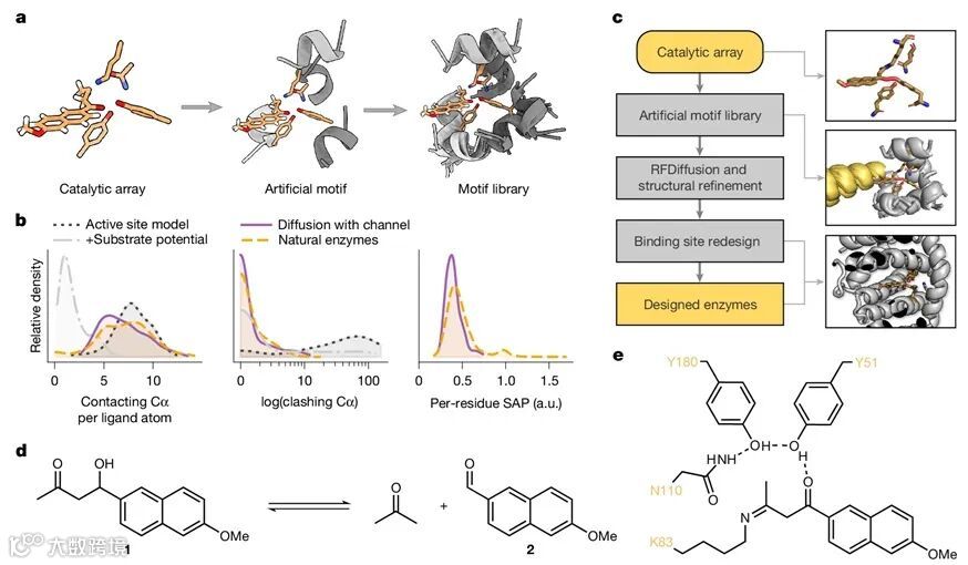 这两篇发表于Nature的背靠背论文,分别开发并验证了能够从零开始、高效设计出具有高催化活性酶的人工智能方法,突破了传统酶设计需要预先、精确固定催化残基所有自由度(序列位置、构象)的桎梏,无需依赖传统的“设计-筛选-定向进化”多重循环,仅通过计算机设计,便能快速、直接获得催化效率媲美甚至超越早期进化阶段人工酶的高性能催化剂。这些成果标志着计算酶设计领域迈入了一个崭新的AI驱动时代。