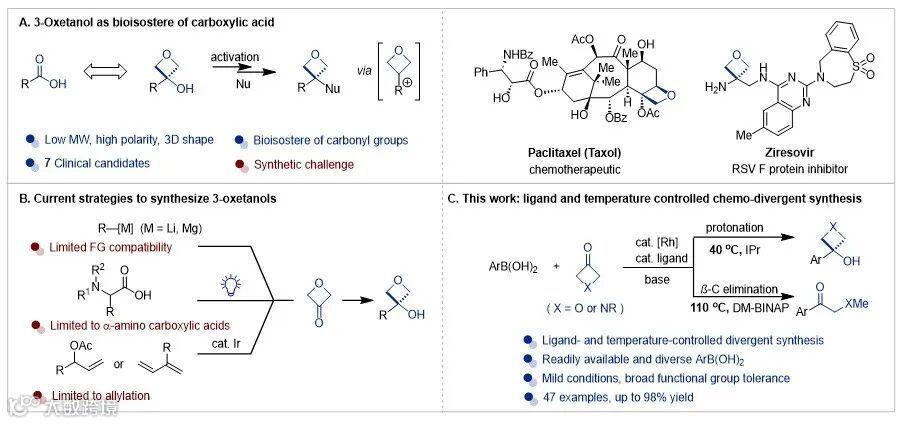 脂肪族四元杂环,特别是氧杂环丁烷和氮杂环丁烷,是药物化学中的优势结构单元,理化性质优异,包括低分子量、高极性和非平面结构等。这类杂环还可以作为某些官能团的生物电子等排体,例如氧杂环丁烷可以替代羰基,提升化合物的水溶性、代谢稳定性,同时降低亲脂性。在实际应用中,脂肪族四元杂环广泛存在于药物和天然产物中,例如,抗癌药物紫杉醇(Taxol)中就含有氧杂环丁烷结构,此外,目前已有7个含氧杂环丁烷结构的候选药物正在进行临床试验。自从Carreira、Rogers-Evans及其同事的开创性贡献,3,3-二取代的氧杂环丁烷在过去的二十年里吸引了大量药物化学家和合成化学家的研究兴趣。然而,合成3,3-二取代的氧杂环丁烷衍生物,如3-氧杂环丁烷醇(羧酸的生物电子等排体)的方法,仍然是局限的。最近,Bull等人在3-芳基氧杂环丁烷醇的转化方面做出了杰出的贡献,从而得到各种羧酸衍生物的生物电子等排体。