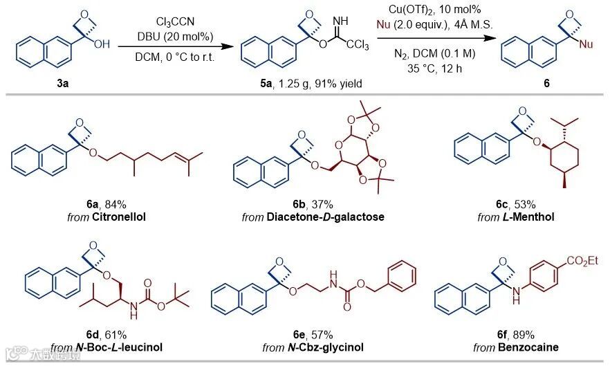 为验证本方法的合成应用潜力,作者实现了3-芳基氧杂环丁醇的后期官能团化(图3)。参照张海军课题组已报道方法,作者以3a为原料以91%收率合成氧杂环丁基三氯乙酰亚胺酯5a。该中间体与伯仲烷基醇(香茅醇、二丙酮-D-半乳糖)、氨基酸衍生物(N-Boc-L-亮氨醇、N-Cbz-甘氨醇)及芳胺(苯佐卡因)均能顺利反应,以37-89%的中等至良好收率得到目标产物6a-6f。