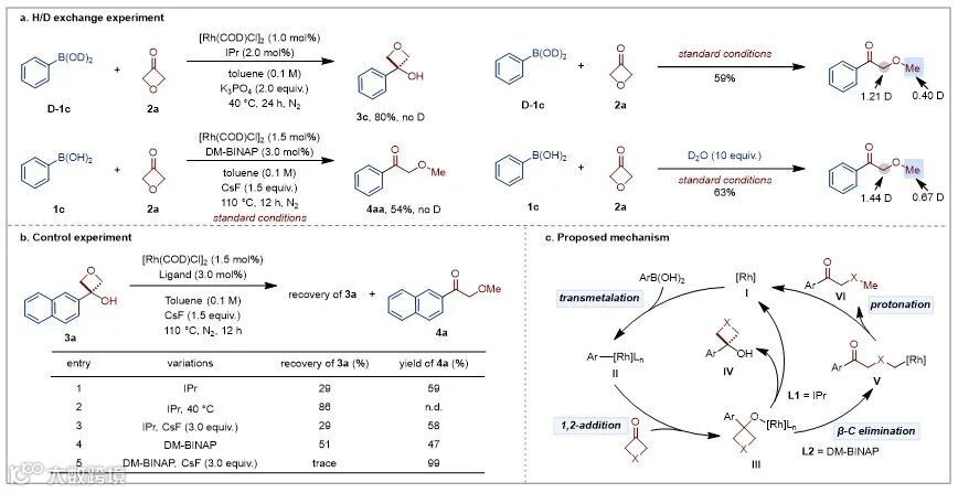 为了研究反应机理,进行了一系列机理实验(图4),为验证该反应的氢源,作者首先使用PhB(OD)2作为底物进行了H/D交换实验(详见支持信息)。虽然在合成3-芳基氧杂环丁醇时未观察到产物3c中的氘代现象,但在开环反应中检测到羰基末端甲基及相邻亚甲基的局部氘代。同样地,在标准条件下向反应体系添加D2O也产生了类似结果。这些结果表明转化过程中的氢源可能来自芳基硼酸和体系中的水。作者推断3-芳基氧杂环丁醇是开环反应的中间体,因此在对照实验中选用3a作为底物。当使用1.5当量碱时,两种配体在升高温度时表现相当;然而当碱负载量增至3.0当量时,DM-BINAP能有效促进反应,而使用IPr配体的性能保持不变。值得注意的是,在较低温度下IPr和DM-BINAP配体均无法驱动开环过程。综上所述,配体选择与反应温度对开环反应均具有决定性作用。