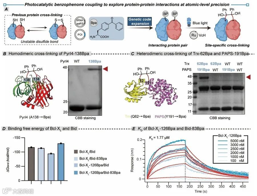 作为解析蛋白质-蛋白质相互作用的关键技术,本方法实现了极简化操作下的高效精准交联:仅需在目标蛋白特定位置引入光交联探针苯甲酮丙氨酸(Bpa),即可通过光催化触发高效交联,显著优于传统多步骤、低特异性的交联策略。实验结果表明,在PyrI4的A138、Q62、PAPS的Y191、Bcl-XL的V126及Bid的I83等位点引入Bpa后,均能在光催化条件下实现位点特异性交联。串联质谱验证了Bpa残基间频哪醇连接的形成,支持了酮基自由基偶联的交联机制。对照实验证实交联反应依赖于蛋白质间的邻近作用:在Bcl-XL的远端位点A171引入Bpa,或通过热处理破坏蛋白质相互作用,均会抑制交联;非相互作用蛋白的交叉实验进一步证实了邻近作用的关键作用,验证了该方法的特异性。为评估Bpa引入对蛋白质结构和功能的影响,研究人员进行了分子动力学模拟和生物物理实验,表明光催化酮基自由基偶联策略在实现精准蛋白质修饰的同时,能保留天然蛋白质的结构和功能。这一突破不仅提供了“分子尺”级的精准测量工具,更为动态生命过程研究奠定了新一代方法学基础。