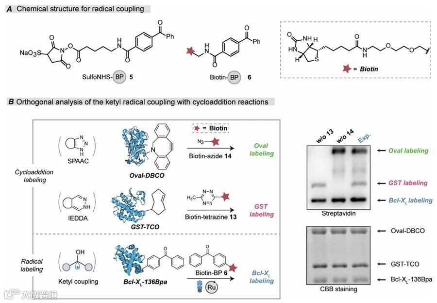 为验证该反应在蛋白质标记中的适用性,研究人员通过SulfoNHS-BP 5将二苯甲酮基团修饰到Bcl-XL蛋白上,并设计合成了含生物素报告基团和二苯甲酮结构的标记探针Biotin-BP 6。在Ru (bpy)3Cl2、VcH 存在下经蓝光照射后,Western blot分析显示Bcl-XL蛋白被高效标记,而未修饰的Bcl-XL无标记信号,证实了反应特异性。研究团队发现该光正交反应展现出卓越的兼容性,可与张力促进的炔-叠氮环加成(SPAAC)和逆电子需求的Diels−Alder(IEDDA)等经典生物正交技术交叉兼容,实现多重蛋白质标记。研究人员将光催化酮基自由基偶联与SPAAC、IEDDA反应组合,在一锅体系中同时处理分别标记有不同正交基团的三种蛋白质(GST-TCO、Oval-DBCO和Bcl-XL-136Bpa)及其对应生物素化探针。严格的控制实验证实各反应通道间交叉干扰低于5%,均能独立高效地实现特异性标记,为复杂蛋白质体系的多维度研究提供了新型工具。