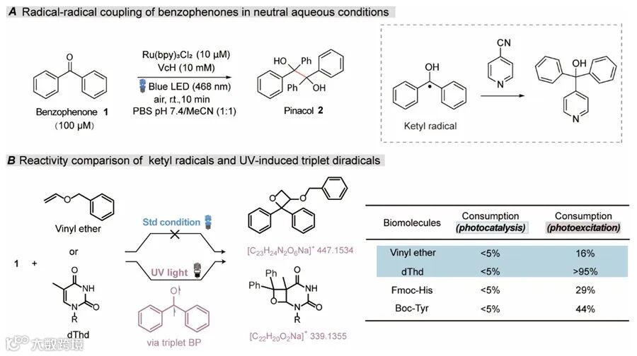 针对传统自由基反应在生物应用中存在的选择性与靶向性难题,研究团队系统解析了传统紫外激发交联技术的核心瓶颈:其产生的三线态双自由基(高活性且难以调控的反应中间体)易引发环加成和氢原子攫取等副反应,导致非特异性交联和生物分子损伤。基于陈以昀课题组在光催化温和生成酮基自由基(Angew. Chem., Int. Ed. 2016)、蛋白质标记(JACS Au 2021)、脂质标记(Nat. Chem. 2025)及核酸标记(Chin. J. Chem. 2025)等领域的系统性研究积累,团队经过多年攻关,成功构建了新型可见光催化体系。该体系在水溶性钌催化剂与抗坏血酸的协同作用下,通过单电子转移机制在中性水相中高效生成稳定的二芳基酮自由基,首次实现了生物正交条件下的精准频哪醇偶联。该机制避免了三重态双自由基的形成,通过空间位阻和共振效应延长自由基寿命,同时降低传统 HAT/[2+2] 副反应。这些酮基自由基的超快均相偶联(速率常数 k=5.9×107 M-1 s-1)能够竞争过生物分子淬灭途径,实现生物正交的蛋白质修饰与交联,将副反应发生率从传统方法的>20%显著降至5%以下,从根本上提升了交联特异性与生物相容性。