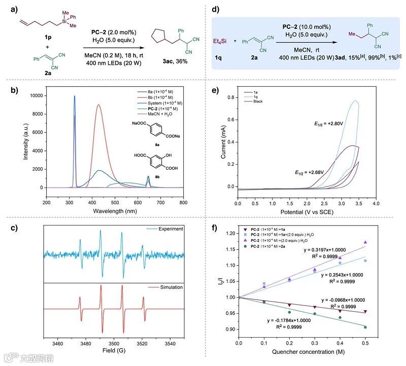作者通过系统的机理实验探究了可能的反应途径。首先,自由基钟实验证实了自由基中间体的存在(图5a)。随后,利用荧光探针与EPR技术直接检测到•OH的生成,支持了H2O在光催化条件下被氧化产生•OH(图5b-c)。对惰性Et4Si的成功活化进一步证明了该策略对活化强C(sp3)–Si键的有效性(图5d)。循环伏安法测试表明硅烷1a和1q的氧化电位极高,排除了其被催化剂直接氧化的主要路径(图5e)。紫外-可见吸收光谱试验说明1a、2a、H2O 之间没有形成明显的EDA络合物。荧光淬灭实验则表明,H2O对催化剂的淬灭能力最强(图5e-f)。这些实验结果说明反应更可能通过羟基自由基进攻引发,而非硅烷与H2O预先形成复合物或经历硅正离子自由基路径。