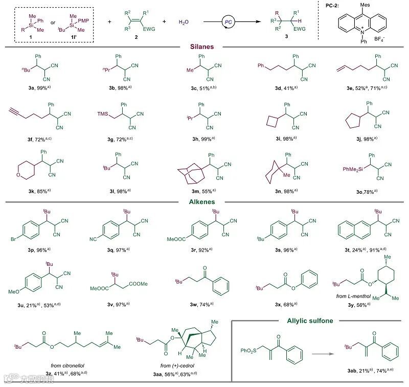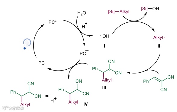根据以上证据,作者提出了可能的机理(图7):在光照下,激发态的光催化剂氧化H2O产生•OH,其进攻硅烷导致C(sp3)–Si键均裂生成烷基自由基,随后被烯烃捕获、还原并质子化得到产物。