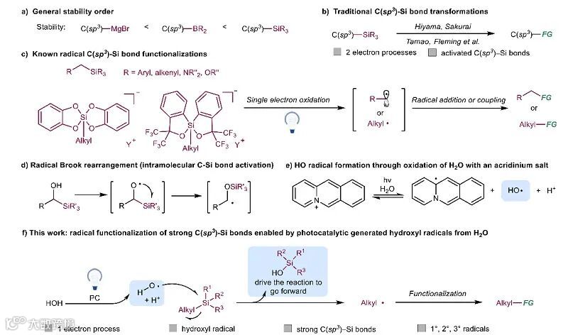 最近,武汉大学沈晓课题组受自由基Brook重排(烷氧自由基活化分子内C–Si键)(图1d)及吖啶盐被光激发氧化水产生羟基自由基(•OH)的启发(图1e),创新性地提出利用H2O在光催化条件下产生的•OH进攻未活化的C(sp3)–Si键,首次实现了该类强键的均裂驱动烷基化反应(图1f)。该转化的关键是通过吖啶盐光催化剂氧化H2O生成 •OH,进而直接进攻硅烷,释放出烷基自由基,随后与缺电子烯烃发生自由基加成,还原质子化,最终得到烷基化产物。这一工作发表在近期的Angew. Chem. Int. Ed.上。
