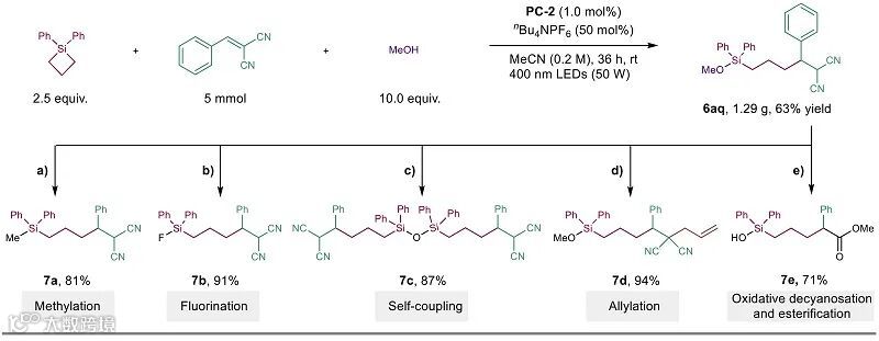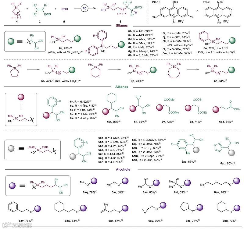 鉴于硅基团在化学、材料和药物科学中的重要性,作者深入探索了硅杂环化合物在C(sp3)–Si键自由基官能化反应中的适用性,该策略能够在产物中有效保留硅基团(图3)。通过条件优化,确立了以吖啶盐PC-2为催化剂、H2O参与并添加nBu4NPF6(其可能通过改善硅杂环、水与乙腈的互溶性而促进反应)的MeCN/蓝光反应体系,使1,1-二苯基硅杂环丁烷与烯烃以78%产率生成化合物6a。此优化策略展现出优异的普适性:多种1,1-二芳基硅杂环丁烷,无论芳环带吸电子、中性或给电子取代基,以及五至七元硅杂环均能高效发生开环烷基化,产率良好;同时,反应兼容包括丙二腈衍生物、各类缺电子烯烃以及从简单醇到长链、环状醇在内的底物,成功构建了结构多样的γ-官能化硅醇与硅醚产物,证实了该开环双官能化方法具有广泛的底物适应性。