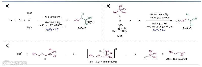 关键的动力学同位素效应实验显示:使用D2O时KIE值较小(kH/kD =1.3),表明•OH生成或质子化并非决速步;而使用氘代硅烷1c-D时观察到显著的KIE值(kH/kD = 6.2),支持了C(sp3)–Si键的断裂可能是反应的决速步骤(图6a-b)。理论计算进一步支持该键断裂在热力学上可行(图6c)。