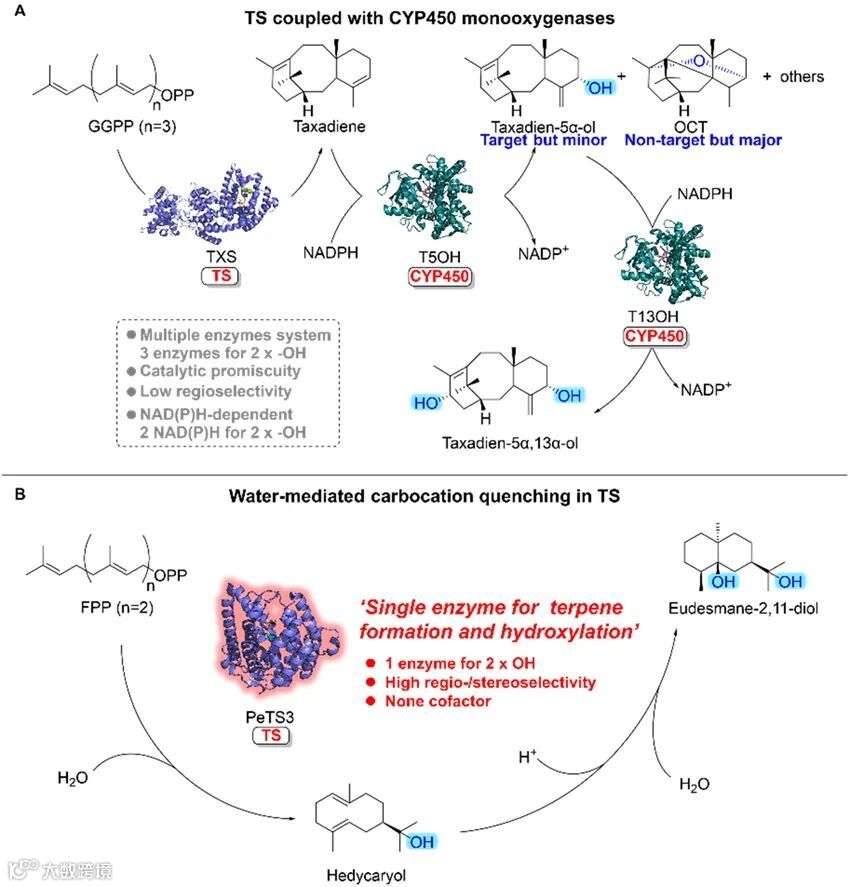 图1. (A) 萜烯合酶偶联CYP450合成双羟基化萜烯; (B) 萜烯合酶催化的水分子介导的碳正离子猝灭合成双羟基化萜烯。