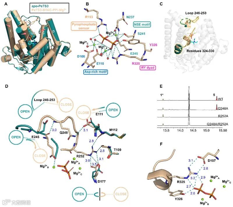 图2. (A) PeTS3-BTAC-PPi-Mg2+复合物结构与apo-PeTS3结构的对比分析; (B) Mg2+离子(绿球)、焦磷酸基团与活性位点残基的相互作用; (C) PeTS3-BTAC-PPi-Mg2+复合物与apo-PeTS3的Loop 246-253和Residues 324-330的结构差异; (D) Loop 246-253在酶开放及关闭构象下的结构变化; (E) Gln248和Arg252的突变产物GC-MS分析结果。化合物1* (elemol) 为中心中间体1 [(+)-hedycaryol] 的Cope重排产物,化合物5为eudesmane-2,11-diol; (F) R-Y二联体与焦磷酸集团和Asp107的相互作用。