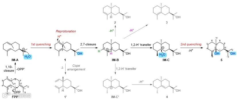 图3. PeTS3催化FPP环合形成二羟基萜烯的环合机制。碳原子编号与底物法尼基焦磷酸(FPP)一致。