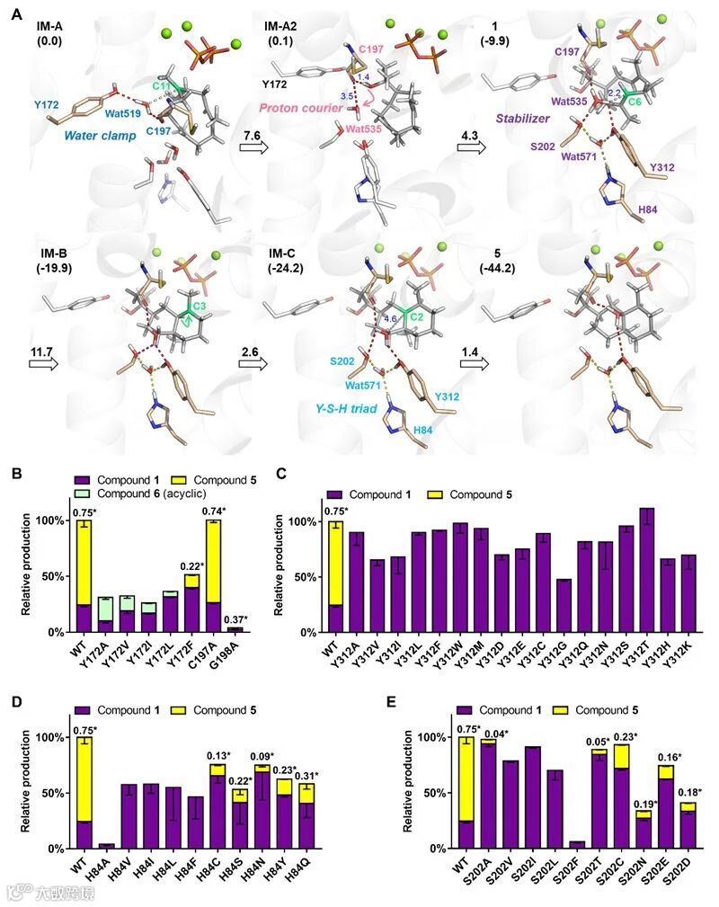 图4. (A) QM/MM计算捕获的化合反应关键中间体; (B) Tyr172、Cys197、Gly198的位点突变分析; (C) Tyr312的位点突变分析; (D) His84的位点突变分析; (E) Ser202的位点突变分析。括号中给出了相对于IM-A模型的能量值(kcal/mol),白色箭头上方指示了能量势垒。每个步骤中涉及的关键残基使用小麦色显示,而其他残基则以白色显示。碳正离子呈现为绿色;无环倍半萜6为橙花叔醇;由野生型PeTS3(WT)形成的化合物1和5的产量被指定为100%,用于定义相对产量。星号(*)表示二羟基萜烯5在PeTS3或其变体产生的总萜烯中的比例。