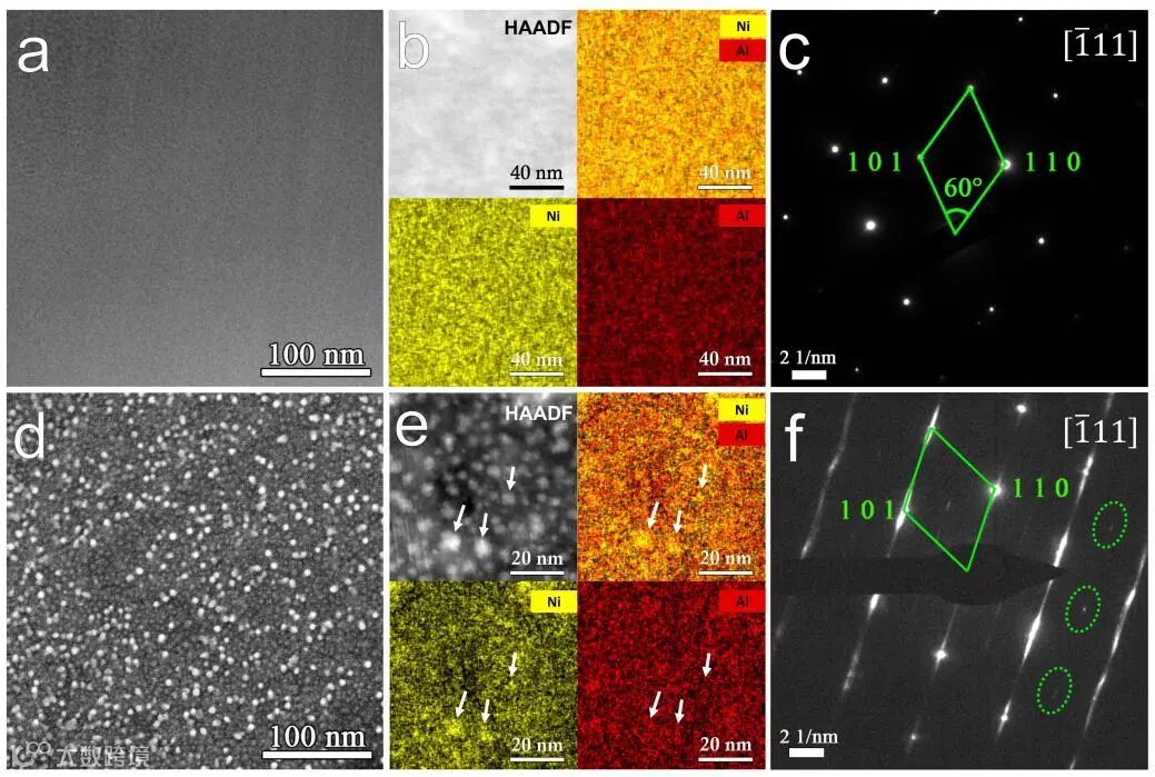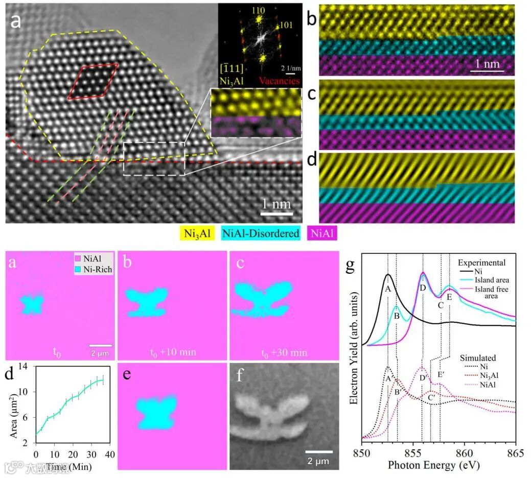 图2. NiAl合金退火过程中形成γ'-Ni3Al沉淀物的TEM(上)和谱学(下)表征。图片来源:Nat. Commun.