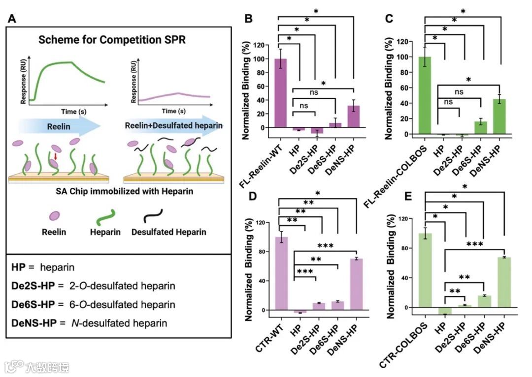 图1. 竞争性SPR表明N-去硫酸化显著削弱了 Reelin 与 HS 的相互作用