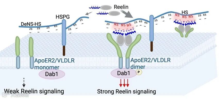 图3. Reelin 信号通路中 Reelin–HS相互作用模型。HS的 N-硫酸化通过与 Reelin 表面正电荷相互作用,作为共受体增强 Reelin 信号激活,促进 Dab1 磷酸化及其下游效应。
