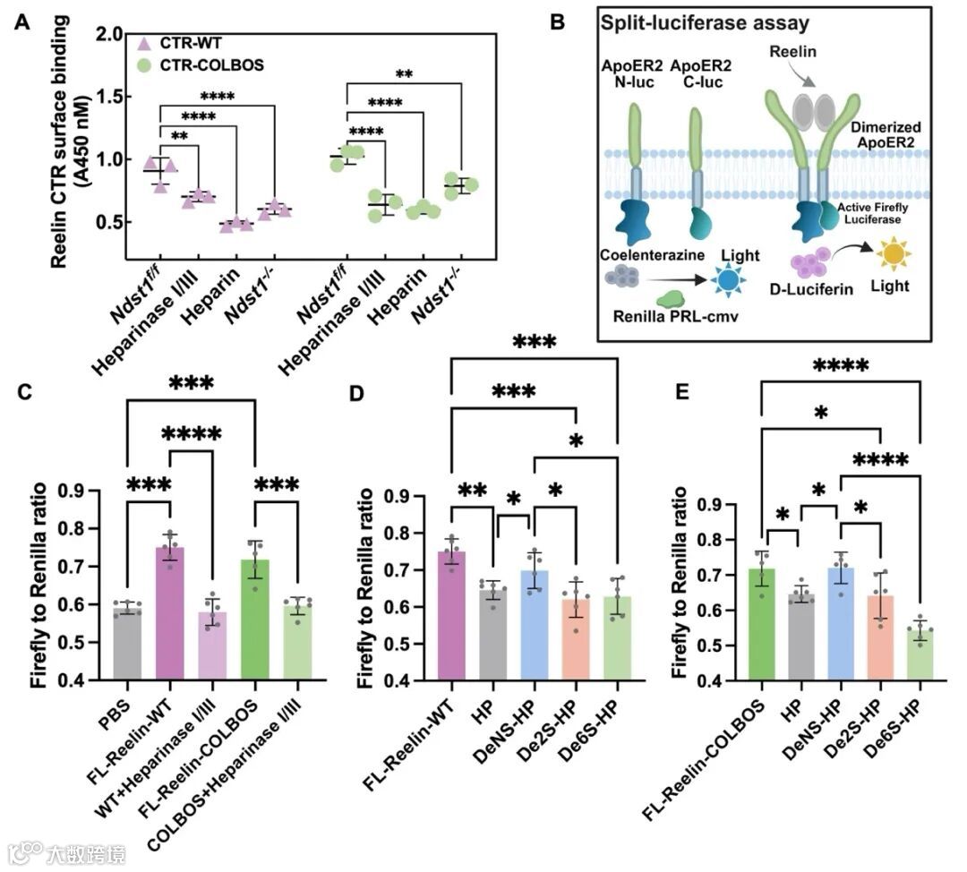 在细胞水平,研究者通过敲除HS N-硫酸化的关键酶 NDST1,显著降低了细胞表面HS的 N-硫酸化水平。细胞表面结合实验表明,无论是通过酶法降解细胞表面的HS,还是降低其 N-硫酸化程度,均会明显削弱 Reelin 与细胞表面的结合能力。更为重要的是,利用分裂荧光素酶体系监测 Reelin 诱导的受体 ApoER2 二聚化过程发现,HS的存在对于 Reelin 介导的受体激活至关重要:去除细胞表面HS或使用外源肝素进行竞争,均显著抑制 Reelin 诱导的 ApoER2 二聚化,而 N-去硫酸化肝素的抑制作用则明显减弱。这些结果从功能层面表明,HS是 Reelin 信号通路激活过程中不可或缺的共受体, N-硫酸化在其结合中具有重要作用。