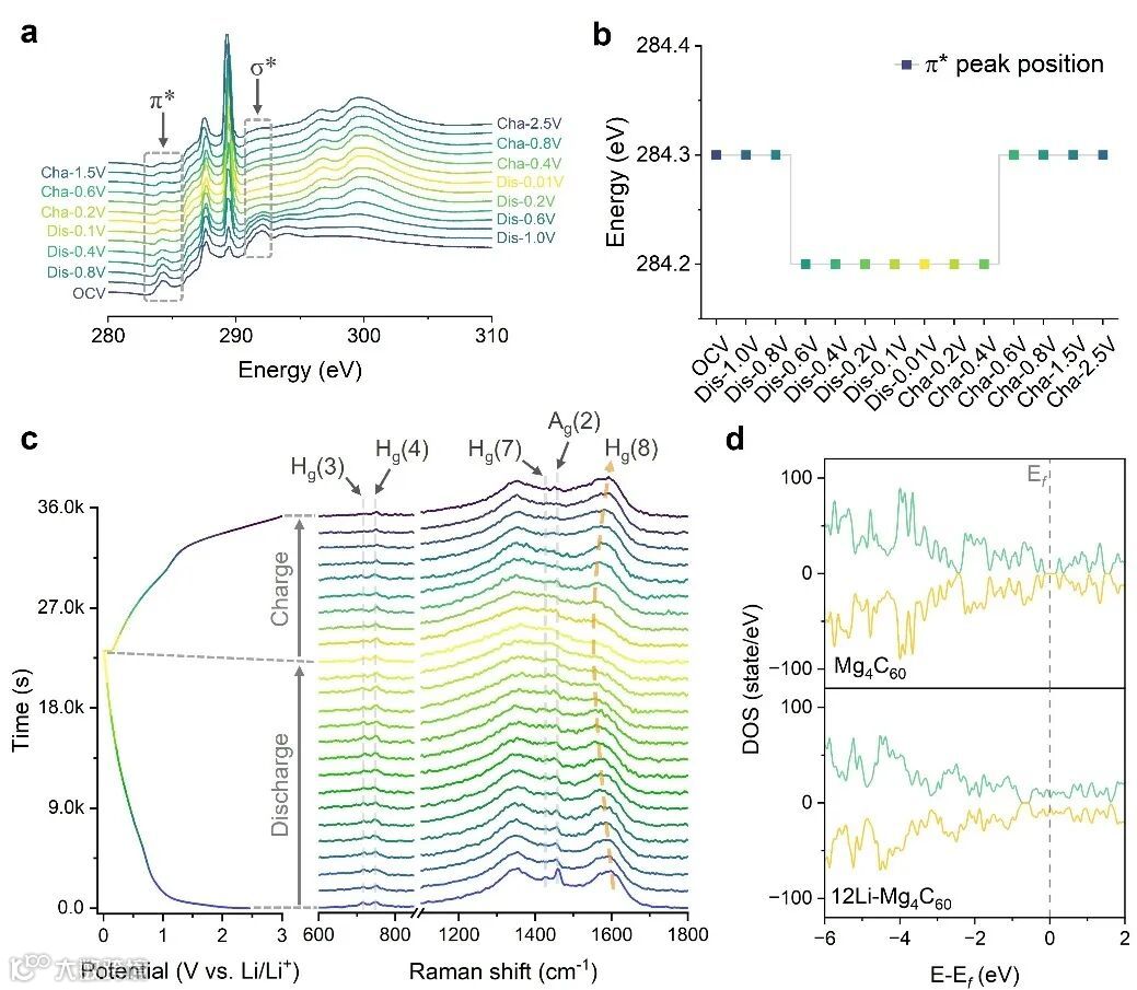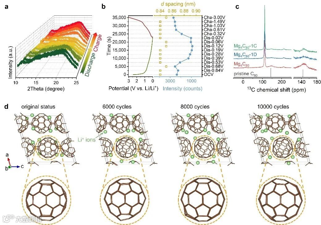 进一步的机理研究揭示,Mg4C60的储锂行为明显区别于石墨的分级嵌锂机制和无定形碳的孔填充行为。原位同步辐射粉末衍射显示,在整个嵌锂/脱锂过程中,Mg4C60的层间距几乎保持不变,未观察到明显相变,表明其储锂过程以连续固溶体形式进行。固态核磁、原位Raman以及第一性原理分子动力学模拟进一步表明,锂离子主要分布在富勒烯笼体之间的分子间空隙中,嵌锂过程中伴随着C60笼体的轻微、可逆畸变以及π/σ电子结构的动态重构。值得强调的是,这种结构调整仅发生在局域尺度,而整体共价桥连框架在整个循环过程中始终保持完整,从而实现了“有序骨架+可逆局域畸变”的独特储锂模式。