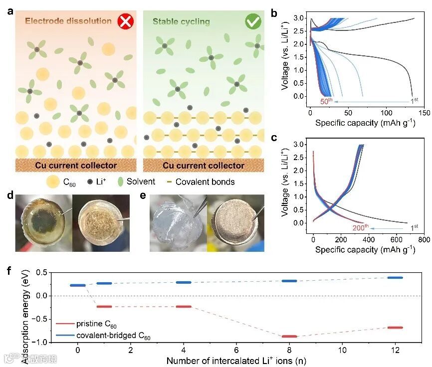 图1揭示了原始C60与共价桥连C60在锂离子电池中的本质差异。原始C60作为典型分子晶体,其结构主要依赖分子间范德华作用维持,在嵌锂过程中易生成可溶的锂化富勒烯阴离子,进而发生溶解和迁移,引发类似锂硫电池中多硫化物穿梭的现象,导致容量快速衰减。通过在C60分子之间引入C–C共价键(包括单键和/或[2+2]环加成键),富勒烯单元被固定在稳定骨架中,从结构层面有效抑制了锂化中间体的解离。与原始C60电极相比,共价桥连C60电极可在碳酸酯电解液中稳定循环超过200圈,且循环后隔膜与锂负极未观察到任何溶解或穿梭迹象。理论计算进一步从热力学角度支持了这一结论:在未锂化状态下,两种体系与碳酸酯溶剂的相互作用相近;而在嵌锂后,原始C60与溶剂的相互作用显著增强,使体系在热力学上倾向于溶解。相比之下,共价桥连后的C60即使在高锂含量下仍与溶剂保持较弱相互作用,表明共价桥连能够从根本上提高锂化富勒烯在碳酸酯电解液中的热力学稳定性。