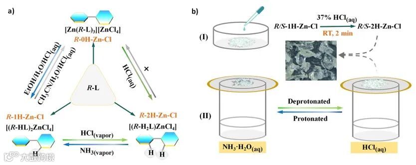 在结构方面:(1)随着联吡啶质子数的增加,金属氯簇阴离子与质子化阳离子之间氢键增加,作用力增强,从而引起金属氯簇四面体变形性的增加,尤其对 (R-2H-Zn-Cl/S-2H-Zn-Cl) 而言,金属氯簇阴离子与质子化阳离子之间的两个氢键诱导阴离子与阳离子形成螺旋链结构,理论上,该螺旋结构更加有利于手性的传递和放大。(2)通过调控溶剂和酸碱度,可以实现这三对手性OIMHs化合物之间的相变。尤其通过调控HCl-NH3蒸汽或水溶液,可以快速实现单质子化与双质子化OIMHs化合物之间的可逆转变。