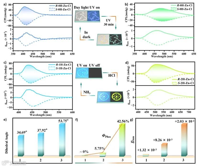 Figure 3. The chiroptical behaviors of these three pairs of chiral OIMHs. (a) CPL spectra of the initial R-0H-Zn-Cl. (b) CPL spectra of the initial R-0H-Zn-Cl after UV irradiation for 30 min. (c) CPL spectra of the initial R-1H-Zn-Cl. (d) CPL spectra of the initial R-2H-Zn-Cl. (e) The trend of the dihedral angle changed from R-0H-Zn-Cl to R-2H-Zn-Cl. (f) The trend of Φphos changed from R-0H-Zn-Cl to R-2H-Zn-Cl. (g) The trend of glum values changed from R-0H-Zn-Cl to R-2H-Zn-Cl.
