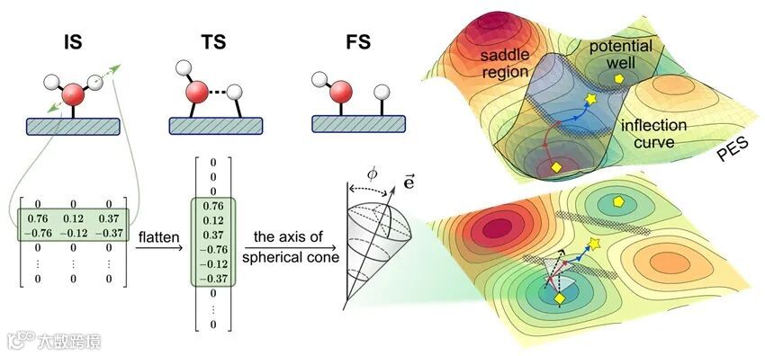 锥约束方向e的定义方式十分灵活。当初末态构型未知但反应机理明确时,e可由一组关键反应键的拉伸或压缩方向线性组合而成。例如,水分子分解中,O–H键拉伸是主要反应坐标(图1绿色箭头),从初始态(菱形)指向过渡态(五角星)的有效逃逸方向通常与O–H键拉伸方向呈锐角。这种基于内禀反应坐标的方法能以化学精度逼近真实路径,为反应坐标估计提供直观可靠依据。若初始态与末态构型均已知时,反应路径就已明确,e则可以通过在当前构型与末态构型之间进行插值来确定。锥约束的引入可在不依赖任何经验参数的前提下,有效引导体系逃逸出势阱区域,提升优化过程的鲁棒性。