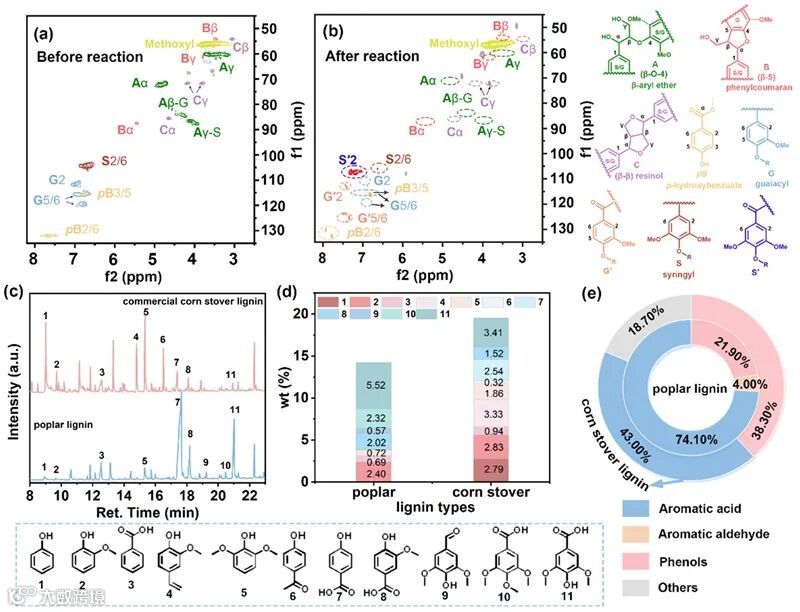 2D-HSQC NMR显示反应后β-O-4键(Cα-Cβ)信号消失,证实选择性断裂。杨木/玉米秸秆木质素解聚单体产率14.24/19.54 wt%,酚类占比21.90%/38.30%。