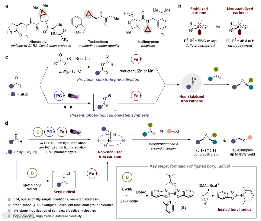 环丙烷结构广泛存在于药物、天然产物和生物活性分子中,其刚性结构可增强与生物靶点的结合能力,并作为烷基/芳基的生物电子等排体,能提高药物代谢稳定性。卡宾与烯烃[2+1]环加成反应是合成环丙烷骨架结构最有效、直接的策略之一,但依赖重氮化合物作为卡宾前体,尤其烷基取代重氮化合物存在高反应性、爆炸风险(如放热自发分解),限制了其应用。近年来,研究者尝试开发非重氮类卡宾前体(如偕二卤化物、磺酰腙等),但普遍存在底物需预活化、反应条件苛刻、适用范围窄等问题。因此,开发一种从廉价、稳定、易得的脂肪醛出发,直接生成非稳定卡宾并实现环丙烷化的新策略,具有重要的科学意义和应用价值。