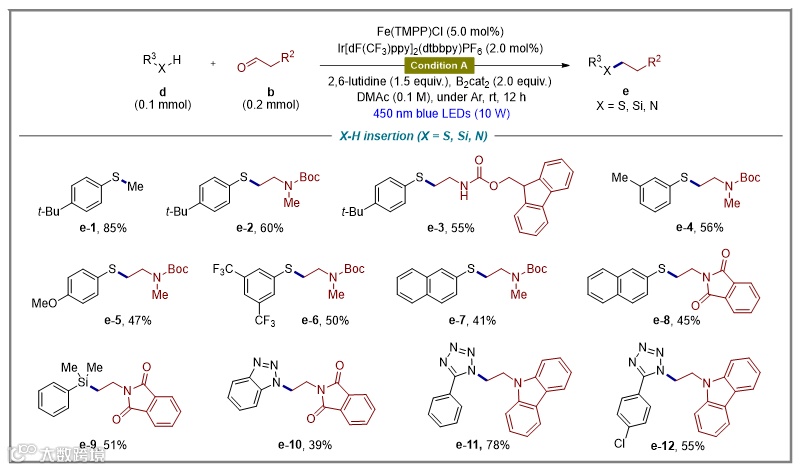 该方法不仅可用于环丙烷化,还可拓展至σ键插入反应,包括S–H、Si–H和N–H键的插入,生成硫醚、硅烷和胺类化合物。这些多样化σ键插入反应的成功实施,不仅证实了烷基铁卡宾中间体突破成环反应的反应机制,更确立了其作为高活性中间体在本自由基策略中的普适性(图4)。