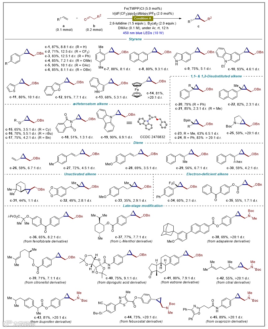 研究方案首先探究了烯烃环丙烷化反应的范围(图2)。反应体系可以很好的兼容各种类型的烯烃,包括:乙烯基芳烃、α-杂原子烯烃、1,1-二取代烯烃、1,2-二取代烯烃、1,3-二烯、非活化烯烃及缺电子烯烃,并能以中等到优异的产率得到环丙烷化产物。同时,对于一些药物分子、天然产物、生物活性分子衍生物的环丙烷化合成也具有优异的表现。