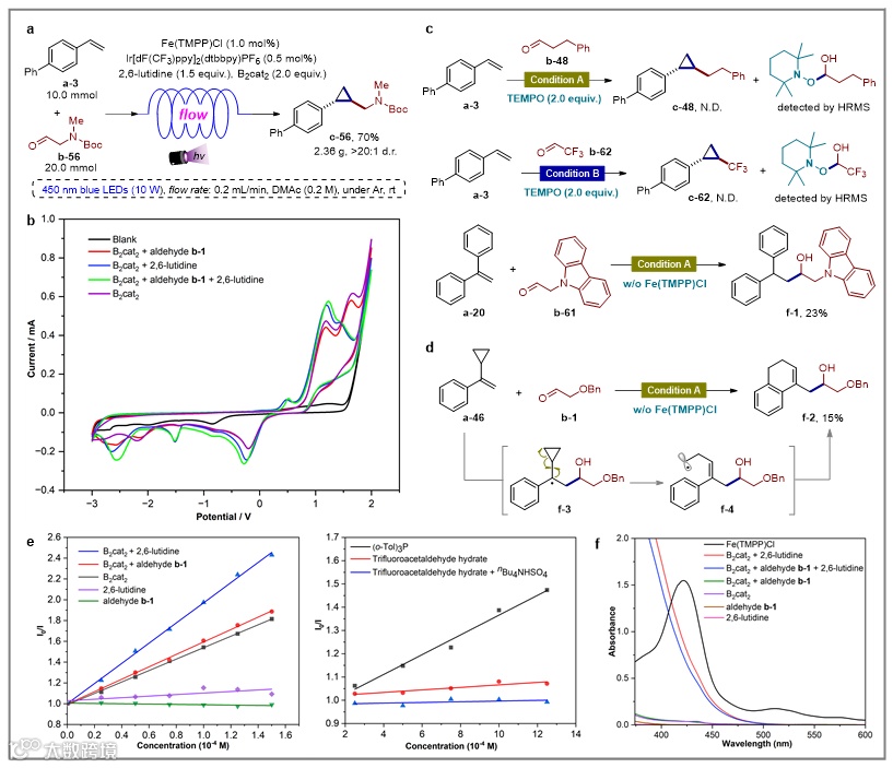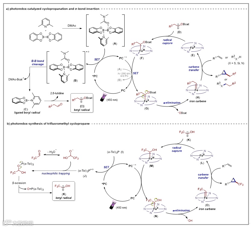 基于该金属光氧化还原催化环丙烷化策略的广谱适用性,作者进一步验证了其规模化潜力。将反应过程通过可扩展的连续流动反应装置进行了放大处理(图5a),与传统方法相比,反应速度大大提高。为探究该金属光氧化还原催化环丙烷化反应中B2cat2与2,6-二甲基吡啶的相互作用,他们进行了循环伏安(CV)研究(图5b)。此外,为了深入阐明反应机制,他们开展了系统实验研究,例如自由基捕获实验(图5c)、自由基钟实验(图5d)、Stern-Volmer淬灭实验(图5e)、紫外-可见吸收光谱实验(图5f)。最终提出了可行的反应机理(图6),在光氧化还原催化的环丙烷化及σ键插入反应(条件A)中(图6a),光诱导反应的引发始于2,6-二甲基吡啶、B2cat2与DMAc形成复合物 (A)。在可见光照射下(λ = 450-455 nm),复合物 (A) 可还原淬灭激发态光催化剂 (PC*),生成自由基阳离子中间体 (B),同时产生还原态光催化剂 (PC⁻•)(条件A)。或者,在无外源光催化剂时,原位形成的电子供体-受体(EDA)复合物 (A) 可被紫光(λ = 390-395 nm)有效激发,其激发态中间体经铁(III)-卟啉络合物 (F) 氧化淬灭,形成自由基阳离子中间体 (B) 与低价态铁(II)络合物 (G)(条件C)。自由基阳离子 (B) 发生硼-硼键断裂,生成关键的吡啶配位硼自由基物种 (C)。该物种进攻醛的羰基形成酮基自由基 (D)。与此同时,Fe(TMPP)Cl催化剂从Fe(III)还原为Fe(II),形成铁(II)络合物 (E)。此铁(II)络合物 (E) 可捕获酮基自由基 (D),经单电子转移 (SET) 过程释放低价态铁(II)络合物 (G),同时完成光催化循环并再生光催化剂 (PC)。低价态铁(II)络合物 (G) 经α-消除形成高活性铁卡宾中间体 (H),该中间体依次进行环丙烷化与σ键插入步骤,最终获得目标产物并使铁催化剂重置为铁(II)络合物 (E)。在三氟甲基环丙烷化体系(条件B)中(图6b),激发的光催化剂 (PC*) 被三(邻甲苯基)磷通过单电子转移过程还原淬灭,生成还原态光催化剂 (PC⁻) 物种与三(邻甲苯基)磷自由基阳离子 (J)。随后,三(邻甲苯基)磷自由基阳离子经去质子化的三氟乙醛水合物亲核捕获,形成磷烷基自由基 (K),该自由基经β-断裂生成酮基自由基中间体 (L)。该酮基自由基中间体通过光氧化还原与铁催化循环的协同作用,高效构建三氟甲基环丙烷产物。