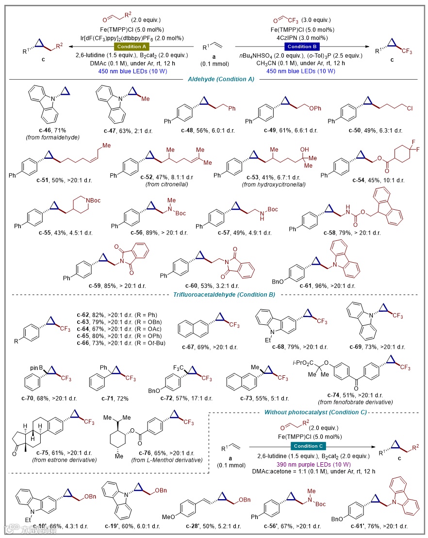 接着进一步考察卡宾前体的适用范围,简单的烷基醛、含卤素、烯烃、羟基、酯基、Boc/Fmoc保护氨基的烷基醛也能成功的实现卡宾的转化,高效地构建环丙烷产物。同时,该方法还成功拓展至三氟乙醛水合物,用于构建含三氟甲基的环丙烷,产物具有优异的立体选择性和生物活性潜力。此外,在无光氧化还原催化剂的条件下,也能顺利的实现烷基醛与烯烃的直接环丙烷化反应(图3)。