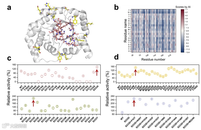 图5. AI辅助酶工程 a,通过理性设计确定的活性中心口袋内关键氨基酸(粉色)与AI预测残基位点(黄色)在DERA结构中的空间分布。b,AI生成评分的热力图可视化。c,活性中心丙氨酸扫描结果及S233位点饱和突变变体的相对活性。d,AI预测的实验验证及S233D与AI识别优势突变的组合效应分析。