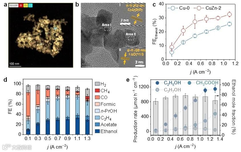 模块一:电化学前台,将CO2高效、高速地转化为关键C2中间体——乙醇。研究团队制备了铜锌纳米合金催化剂。其中,CuZn-2催化剂表现尤为出色。在高达 -1100 mA cm-2 的安培级电流密度下,生产乙醇的法拉第效率仍保持在33%左右,乙醇的生成速率达到了接近 1200 μmol h-1 cm-2的行业顶尖水平。机理研究表明,Zn的引入引发了电子从Zn向Cu的转移,优化了催化剂表面的电子结构。这增强了关键中间体CO的吸附,同时提高了活性氢物种H的浓度,如同为CO2分子的转化铺好了两条并行的“加速跑道”,共同推动了乙醇的高选择性生成。