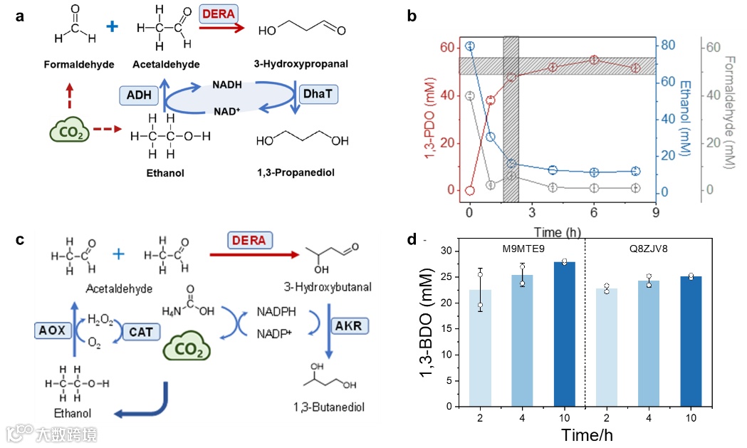 图1. CO2在绿色能源驱动的化学催化条件下被还原为甲醛(C1)和乙醇(C2),随后通过生物催化进行碳链延长生成目标C3和C4高碳二元醇分1,3-丙二醇(1,3-PDO)和1,3-丁二醇(1,3-BDO)。