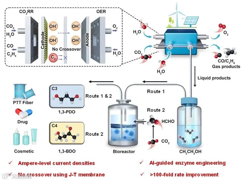 要理解这项研究的重要性,首先需要了解两个背景。(1)C3-C4二醇的价值与困境。1,3-PDO和1,3-BDO是至关重要的平台化学品,广泛应用于聚合物(如性能优异的PTT纤维)、化妆品、制药等领域。全球1,3-PDO的市场价值预计在2031年将达到14.12亿美元。然而,它们的传统合成完全依赖于化石燃料,过程能耗高、污染重。虽然存在以生物质(如葡萄糖、甘油)为原料的发酵法,但这依然未能直接消耗和固定导致全球变暖的元凶——CO2。(2)CO2转化技术的瓶颈。近年来,电化学CO2还原技术取得了长足进步,可以将CO2转化为C2化合物(如乙烯、乙醇)。但该技术始终面临三大桎梏:选择性低,产物复杂,难以高选择性得到单一目标产物;产物有限,直接合成具有更高价值的C3及以上产物极为困难;效率低下,尤其是将CO2转化为多碳醇的速率,远未达到工业化应用的要求。此项研究巧妙地绕过了这些瓶颈,通过一场“跨界合作”,实现了从CO2到高价值C3+化学品的高效转化。