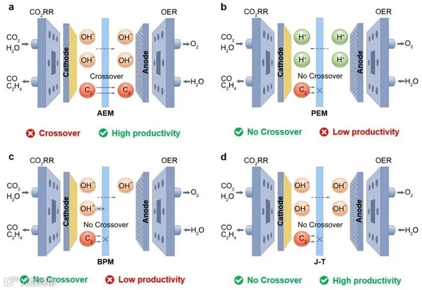 图3. 使用不同膜的CO2电化学还原(CO2RR)过程示意图。a, 阴离子交换膜;b, 质子交换膜;c, 双极膜;d, J-T双层膜(本工作)。