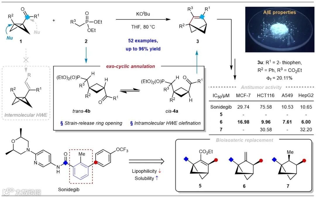 浙江工业大学海洋药物创新团队开发了一种有别于传统“插入”模式的外环化策略,构建了BCB扩环的新路径。该策略以膦酸酯在叔丁醇钾作用下生成的膦酸酯负离子作为亲核试剂,选择性进攻BCB酮的桥头碳,借助张力驱动开环,生成trans和cis两种构型的四元环中间体。这两种中间体在反应体系中可相互转化,但仅有cis-构型中间体能进一步通过分子内HWE烯化反应,构建三取代双环[2.1.1]己烯(BCHe)骨架。值得注意的是,该反应过程中未发现膦酸酯负离子进攻BCB酮羰基所产生的分子间HWE副产物。该方法操作简便、产率良好、官能团兼容性高,可实现多种三取代BCHe的高效合成。研究团队进一步将该方法应用于药物改造,成功完成对上市抗癌药物Sonidegib的苯基生物电子等排体替换。体外细胞实验显示,含环外双键的双环[2.1.1]己烷(BCH)类似物对多种肿瘤细胞表现出优于或相当于Sonidegib的抗增殖活性,初步验证了BCH骨架作为苯基生物电子等排体的潜力。此外,研究还意外发现BCHe骨架具有聚集诱导发光(AIE)特性,推测其三维刚性结构有效抑制了芳环间的π-π堆积,为该类分子在材料科学中的应用提供了新思路。